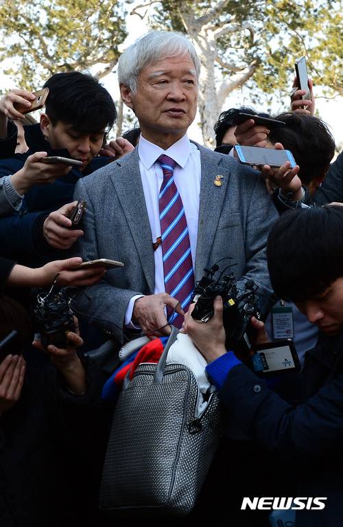 【서울=뉴시스】조성봉 기자 = 박근혜 전 대통령에 대한 탄핵소추안이 인용된 10일 오전 서울 종로구 헌법재판소 대심판정 앞에서 박 전 대통령 측 서석구 변호사가 취재진의 질문에 굳은 표정을 짓고 있다.