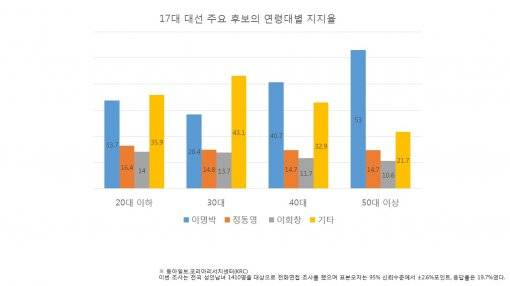 당시 이들의 여론은 어땠을까. 2007년 12월 동아일보 여론조사 결과 연령대별로 당시 이명박 대통령 후보에 대한 지지율은 20대 이하 33.7%, 30대 28.4%였다. 지금의 탄핵 민심과는 달리 40대(40.7%), 50대 이상(53%)의 여론과 큰 차이를 보이진 않았지만 이명박 대통령 후보를 지지 하지 않는 의견이 우세했다.
