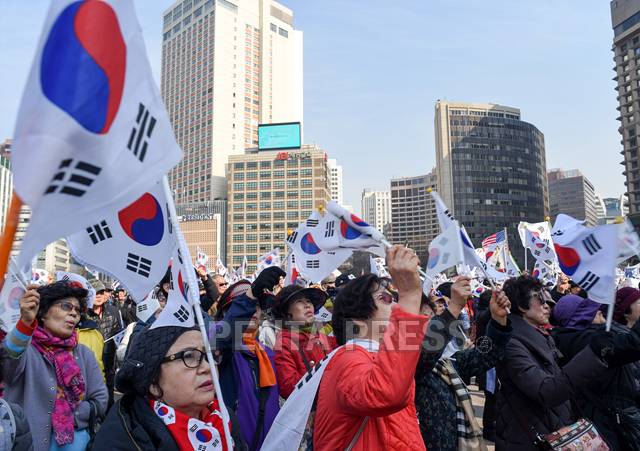 SOUTH KOREAN, SEOUL, MAR. 11, 2017 : Protesters hold South Korean national flags during the protest against Impeachment of President Park Geun-hye by Constitutional Court in Seoul, South Korea, March 11, 2017. Photographer: Steve Jo / PENTA PRESS