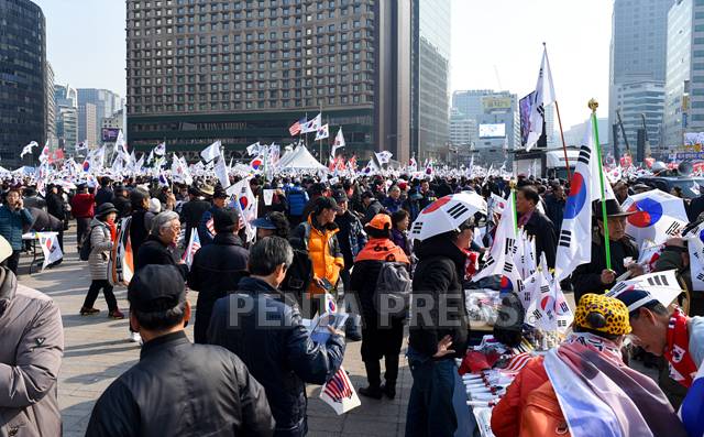 SOUTH KOREAN, SEOUL, MAR. 11, 2017 : Protesters hold South Korean national flags during the protest against Impeachment of President Park Geun-hye by Constitutional Court in Seoul, South Korea, March 11, 2017. Photographer: Steve Jo / PENTA PRESS
