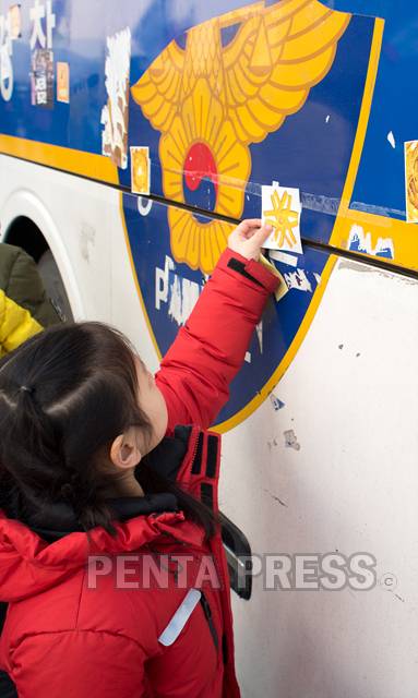[ 펜타프레스 -2017/03/11 ] 어린 참여자가 부모를 따라 경찰버스에 스티커를 붙이고 있다.