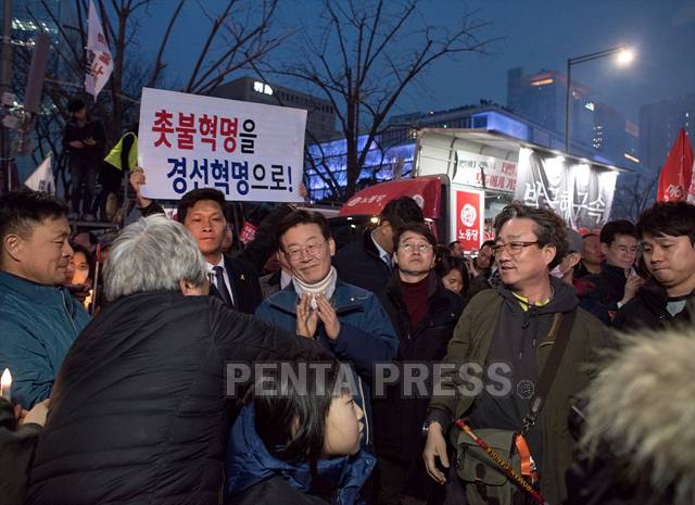 SOUTH KOREAN, SEOUL, MAR. 11, 2017 : Jae Myung Lee, Mayor of SungNam City during celebration of President Park's Impeachment by Constitutional Court in Seoul, South Korea, March 11, 2017. Photographer: Steve Jo / PENTA PRESS