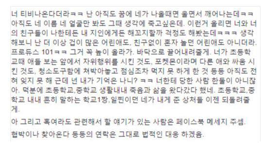 11일 한 네티즌은 페이스북에 "너 TV 나온다더라"며 "난 아직도 꿈에 너가 나올 때면 울면서 깨어난다. 너 이름과 너 얼굴을 보면 그 때 생각에 죽고만 싶다"고 적었다. 이어 "'프로듀스101 시즌2' 꼭 높이 올라가. 바닥으로 끌어내려 주겠다"고 말했다.