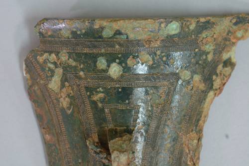 | 검파형 동기 상단부. 테두리를 따라 빗금과 점선무늬가 이중으로 새겨져 있다. 사진제공=전북문화재연구원 |