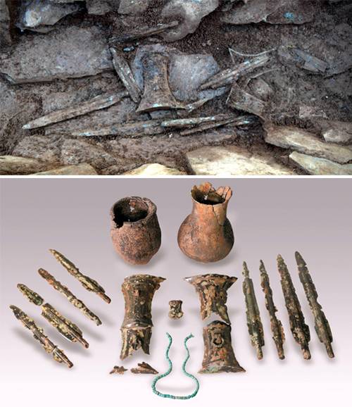 | 전북 군산시 선제리에서 발굴 조사된 적석목관묘 내부 모습(위 사진). 목관 주변을 둘러싼 돌들 사이로 검파형 동기와 세형동검이 보인다. 아래 사진은 보존 처리를 마친 출토 유물들. 칼자루 모양의 검파형 동기 2점(가운데)을 중심으로 양옆에 세형동검이, 그 위로 원형덧띠토기가 놓여 있다. 검파형 동기 사이에 있는 푸른색 목걸이는 환옥이다. 전북문화재연구원 제공 |