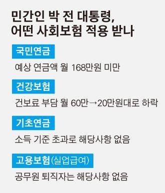 대신 박 전 대통령은 앞으로 지역가입자 신분으로 건강보험료를 별도로 부담해야 한다. 건보료는 재산(삼성동 자택ㆍ25억3,000만원)과 은행 예금(9억8,924만원) 등을 기준으로 부과되는데 이에 따른 건보료는 월 20만원을 조금 넘을 것으로 추정된다.