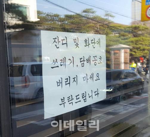 14일 오전 박 전 대통령 자택 주변 상점 유리창에는 ‘주류·취식 절대불가’나 ‘잔디 및 화단에 쓰레기를 버리지 말아주세요’ 등의 문구를 쉽게 찾을 수 있다. 한 상인은 “가게 앞에서 담배를 피우고 아무 데나 버리는 일이 많다”며 “직접 나가서 말하면 일이 커질까 봐 불안하다”고 말했다.