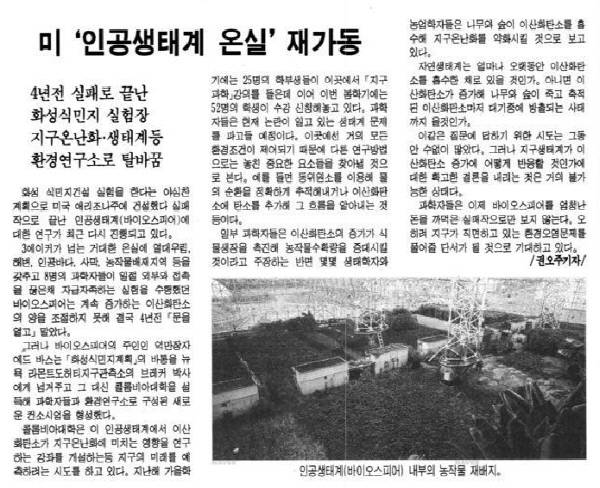 1991~1994년까지 두 차례 인공생태계 실험은 3에이커(약 1만2140㎡)가 넘는 거대한 온실에 열대 우림, 해변, 인공 바다, 사막, 농작물 재배지 등을 갖추고 아마존 등 각종 지방에 있는 식물과 300종에 이르는 동물을 넣어서 생태계를 ‘미니어처화’ 한 것입니다. 8명의 과학자가 일절 외부와 접촉을 끊은 채 자급자족하며 100년간 2년 주기로 교대로 생활한다는 계획이었으나 이산화탄소와 산소 양을 조절하지 못해 실패했습니다. 연구진은 뒤늦게 온실을 만드는 데 사용된 콘크리트가 이산화탄소를 흡수해 식물들이 광합성을 못하면서 산소도 부족해졌다는 것을 알게 됐습니다.