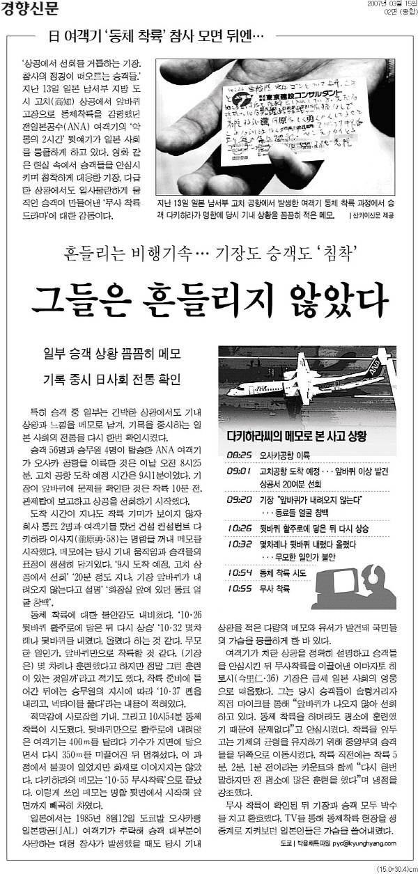 세월호 참사 당시 선장을 비롯한 대다수 승무원들은 승객들에게 ‘가만히 있으라’는 말만 했습니다. 그러나 10년 전 일본 남서부 고치에서 앞바퀴 고장으로 동체착륙을 감행했던 전일본공수(ANA) 여객기의 사례는 세월호와는 정반대 되는 이야기를 들려줍니다. 승객 56명과 승무원 4명이 탑승한 ANA 여객기가 오사카 공항을 이륙해 고치 공항에 도착하기 10분 전 기장은 앞바퀴에 문제가 있다는 것을 확인했습니다. 기장은 고치 공항 상공을 선회하다 20분이 지나서 앞바퀴가 내려오지 않는다고 상황을 설명했습니다. 도착 예정 시각에서 1시간 25분 정도 지나 착륙을 시도했으나 뒷바퀴만 활주로에 닿은 뒤 다시 상승했습니다. 몇 차례나 뒷바퀴를 내렸다 올리기를 반복한 뒤 기장은 도착시간에서 거의 2시간이 지난 시점에서 동체착륙에 성공합니다.