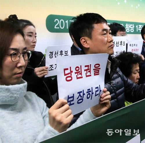 | 안철수 지지 당원 “경선일정 재논의” 14일 서울 여의도 국민의당 당사에 당원 20여 명이 몰려와 경선 일정 재논의 등을 요구했다. 이들은 “지도부가 손학규를 위해 경선 룰을 일방적으로 확정해 안철수 죽이기를 자행했다”고 주장했다. 원대연 기자 yeon72@donga.com |