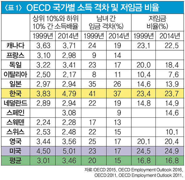 실제로 배규식 선임연구원이 제시한 OECD 자료(2014년, 오른쪽 <표 1> 참조)에 따르면, 한국의 최상위 10%는 하위 10%보다 4.79배의 소득을 벌어들인다. 가장 불평등한 미국의 5.01배 다음이다. 일본(2.94배)이나 스페인(3.08배)은 물론 영국(3.56배)보다 오히려 높다. OECD 기준 ‘저임금 노동자(중위 임금의 3분의 2 이하)’의 비율 역시 미국(24.9%)과 선두를 다투는 23.7%다. 소득 원천 가운데 근로소득의 비중이 가장 높다는 것을 감안하면, 이 같은 격차의 원인이 드러난다. 2015년 현재 대기업 정규직의 임금이 100이라면, 대기업 비정규직과 중소기업 정규직의 월급은 60 정도다. 중소기업 비정규직은 40에도 미치지 못한다. 고임금 부문과 저임금 부문이 확연히 갈린 것이다(오른쪽 <표 2> 참조). 학계에서는 전자를 1차 노동시장(이하 1차), 후자를 2차 노동시장(이하 2차)이라 부른다. 1차의 노동자들은 대체로 기업복지와 고용안정성 등에서도 2차보다 훨씬 좋은 처우를 받는다. 사회보험에서도 마찬가지다. 더욱이 2차의 노동자가 1차로 이동하기는, 낙타가 바늘구멍에 들어가는 것만큼 어렵다. 이른바 ‘노동시장 이중화’다.