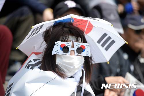 【서울=뉴시스】임태훈 기자 = 18일 오후 서울 중구 대한문 앞에서 열린 보수단체 국민저항본부 대규모집회에서 한 참석자자가 태극기 안경을 쓰고, 탄핵 선고 당일 시위 중 사망한 故 김 모씨 외 2명의 추모행사를 보고 있다. 2017.03.18.
