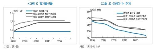 보고서는 지난해 여성 인구와 연령별 사망확률 등을 토대로 합계출생률이 현재 수준에 머무는 상황을 가정한 결과, 출생아 수는 2017년 39만7천명, 2040년 26만7천명, 2060년 20만명으로 줄어들 것으로 예상됐다고 밝혔다.