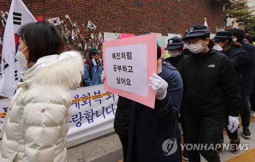 (서울=연합뉴스) 김주성 기자 = 박근혜 전 대통령 자택에 인접한 서울삼릉초등학교 녹색어머니회 학부모들이 20일 오전 "박 전 대통령 지지자들의 시위 때문에 아이들의 등하교 안전이 위협받고 있다"며 어린이 보호구역 밖에서 시위해줄 것을 요구하며 피켓을 들고 박 전 대통령 자택 앞으로 행진하고 있다. 2017.3.20