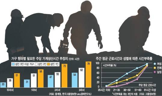 한국인 평균 1주일 총 168시간에서 이 두 가지 필수시간을 빼고 남는 시간은 78시간이 된다. 하루 12시간을 근무하는 사람도 주 5일 기준으로 60시간을 일하는 것이니 시간이 남을 법하다. 그러나 여기에서 간과된 부분이 있다. 바로 한 가구가 유지되는 데 필요한 시간이다. 여성의 평균 가계생산시간은 23.74시간으로 조사돼 있다. 아이 등을 고려하지 않은 전체 평균이기 때문에 아이가 있는 경우 이 시간은 크게 늘어날 수밖에 없다.
