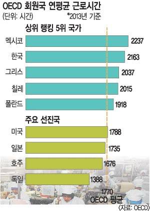 2014년 국민일보는 한국인 근로자 10명 중 4명이 '시간 빈곤'에 시달리고 있다고 보도했다. 한국인의 연간 근로시간(2013년 기준)은 2163시간으로 OECD 24개 회원국 가운데 멕시코 다음으로 길었다. OECD 평균인 1770시간의 1.3배. 연간 2000시간 이상 일하는 나라는 멕시코, 한국, 그리스, 칠레뿐이었다.