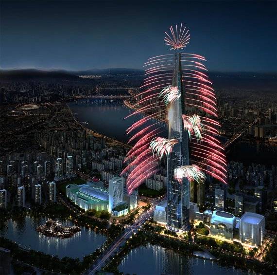 | 다음달 2일 오후 9시부터 진행될 국내 최고층건물인 서울 잠실 롯데월드타워의 불꽃쇼 시안 모습. |