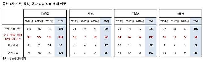 아직 심사 점수가 공개되지 않았지만, 티브이조선은 무엇보다도 방송의 공적 책임과 공정성 관련 항목들에서 다른 종편에 견줘 낮은 점수를 받았을 가능성이 높은 것으로 알려졌다. 지난달 방통위의 ‘종편 재승인 조건 이행실적 점검 결과’를 보면, 2014~2016년 사이 티브이조선의 ‘오보·막말·편파 심의조치 건수’는 383건에 달했다. 반면 채널에이는 195건, 제이티비시는 52건, 엠비엔은 58건이었다. 법정 제재를 받은 건수도 티브이조선(53건)이 채널에이(32건), 제이티비시(17건), 엠비엔(9건)보다 월등히 많았다. 이 같은 실태는 감점의 형태로 반영되는 정량적 평가뿐 아니라 심사위원들의 정성적 평가에도 영향을 줬을 가능성이 있다.