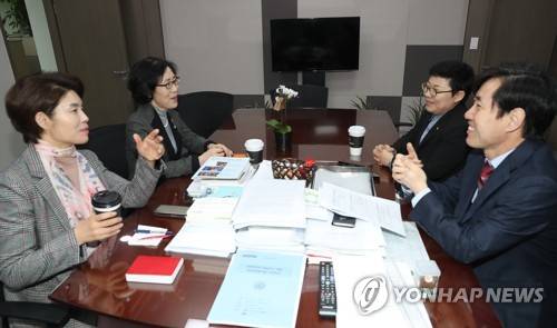 (서울=연합뉴스) 안정원 기자 = 국회 환경노동위원회 4당 간사들이 24일 오전 국회 의원회관 더불어민주당 한정애 의원 사무실에서 주당 최대 근로시간을 68시간에서 52시간으로 줄이는 근로기준법 개정안 논의를 하고 있다.