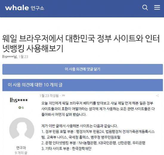 웨일에 대한 클로즈베타서비스를 진행 중이던 1월23일 'lhs****'라는 사용자는 직접 국내 인터넷뱅킹, 공공 사이트에 접속해 본 결과를 웨일연구소 게시판에 알렸다.(☞관련링크)
