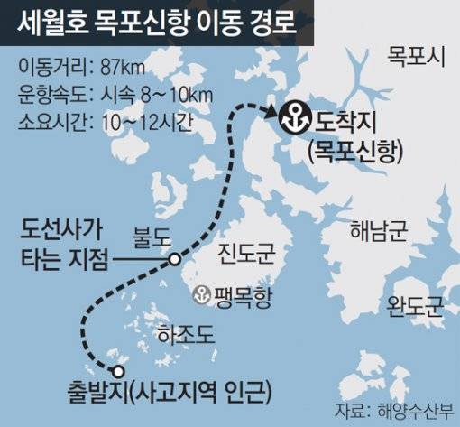 이르면 28일에는 세월호 선체가 목포신항으로 출발할 예정이다. 세월호를 선적한 반잠수식 선박은 동거차도와 서거차도의 오른쪽으로 빙 둘러 북쪽으로 향한 뒤 불도에 잠깐 정박한다. 여기서 크기가 큰 반잠수식 선박이 좁은 항로를 안전하게 운항할 수 있도록 도선사를 태우고 목적지까지 이동한다. 반잠수식 선박은 시속 8∼10km로 움직일 예정이어서 약 10∼12시간이 걸릴 것으로 보인다. 세월호가 옮겨질 목포신항에는 CNN, BBC, 중국중앙(CC)TV, 알자지라 등 국내외 취재진 1000여 명이 사전 취재 신청을 하는 등 열띤 취재 열기를 반영했다.