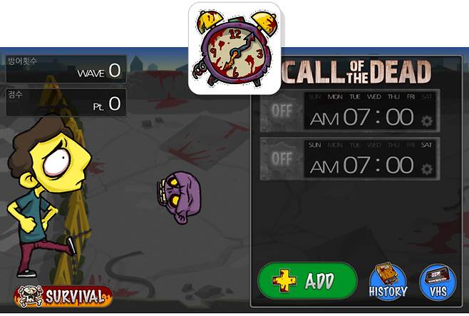하루를 재미있게 시작하고 싶다면 Call of the Dead ? 좀비 알람(ios 지원) /무료평소 좀비 영화를 좋아한다면 주목. 몰려오는 좀비들을 다 죽여야만 알람이 멈춘다. 으스스한 좀비 비주얼이 아침잠을 확실히 깨워줄 것 같다. 총 50개의 스테이지로 매일매일 다이나믹한 아침을 맞게 해준다. 설정해둔 시각에 정확히 알람을 끄면 좀비 비디오도 볼 수 있으니 좀비 영화 마니아라면 써봐도 좋을 듯. 스릴★★★★★ 강력함★★★★