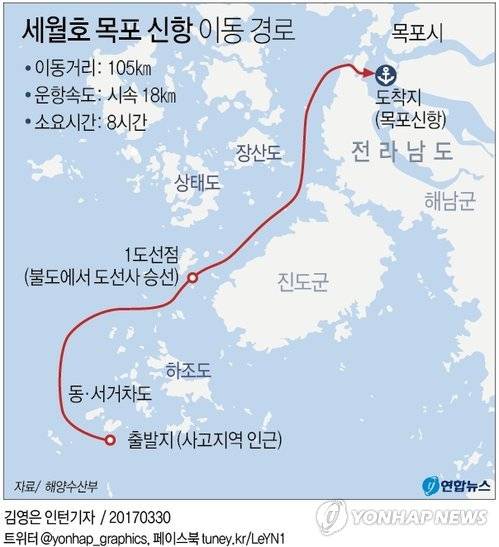 세월호는 시속 18.5㎞의 속도로 동거차도, 서거차도를 통과하고 오전 9시30분께 가사도 해역에서 도선사를 태워 뱃길을 안내받는다.