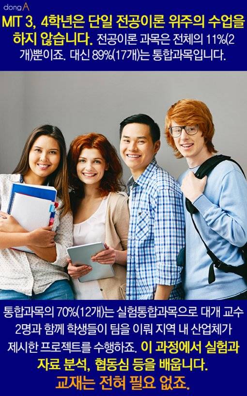 MIT 3, 4학년은 단일 전공이론 위주의 수업을 하지 않습니다. 전공이론 과목은 전체의 11%(2개)뿐이죠. 대신 89%(17개)는 통합과목입니다. 통합과목의 70%(12개)는 실험통합과목으로 대개 교수 2명과 함께 학생들이 팀을 이뤄 지역 내 산업체가 제시한 프로젝트를 수행하죠. 이 과정에서 실험과 자료 분석, 협동심 등을 배웁니다. 교재는 전혀 필요 없죠.