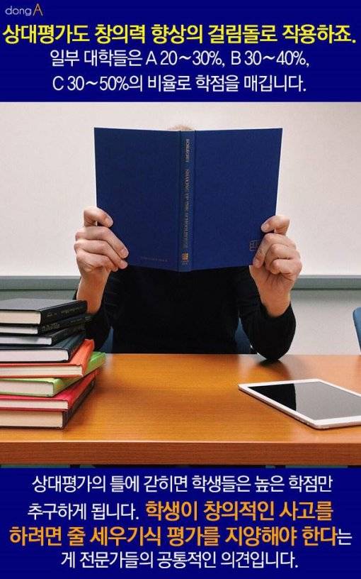 상대평가도 창의력 향상의 걸림돌로 작용하죠. 일부 대학들은 A 20¤30%, B 30¤40%, C 30¤50%의 비율로 학점을 매깁니다. 상대평가의 틀에 갇히면 학생들은 높은 학점만 추구하게 됩니다. 학생이 창의적인 사고를 하려면 줄 세우기식 평가를 지양해야 한다는 게 전문가들의 공통적인 의견입니다.
