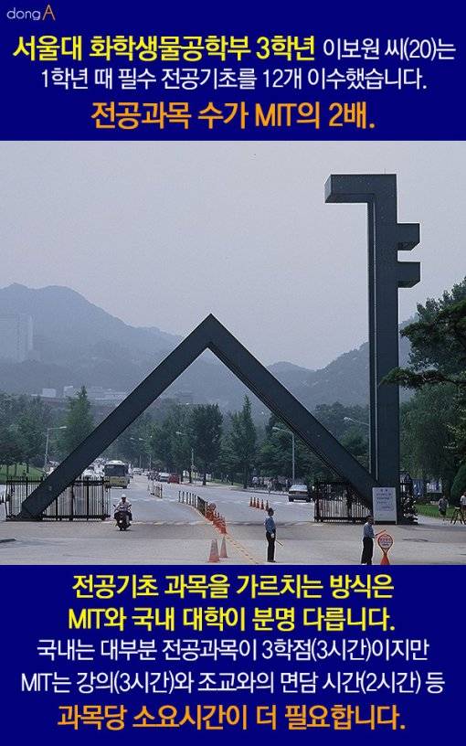 서울대 화학생물공학부 3학년 이보원 씨(20)는 1학년 때 필수 전공기초를 12개 이수했습니다. 전공과목 수가 MIT의 2배. 전공기초 과목을 가르치는 방식은 MIT와 국내 대학이 분명 다릅니다. 국내는 대부분 전공과목이 3학점(3시간)이지만 MIT는 강의(3시간)와 조교와의 면담 시간(2시간) 등 과목당 소요시간이 더 필요합니다.