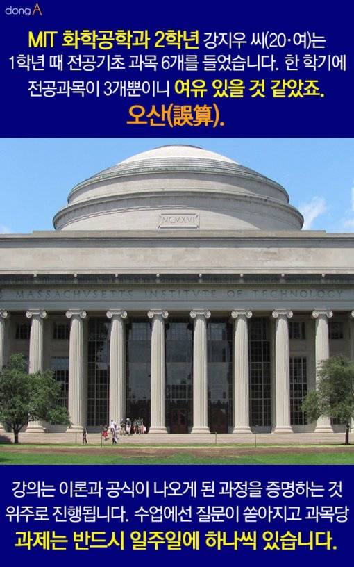 MIT 화학공학과 2학년 강지우 씨(20·여)는 1학년 때 전공기초 과목 6개를 들었습니다. 한 학기에 전공과목이 3개뿐이니 여유 있을 것 같았죠. 오산(誤算). 강의는 이론과 공식이 나오게 된 과정을 증명하는 것 위주로 진행됩니다. 수업에선 질문이 쏟아지고 과목당 과제는 반드시 일주일에 하나씩 있습니다.
