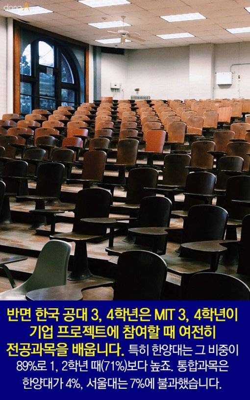 반면 한국 공대 3, 4학년은 MIT 3, 4학년이 기업 프로젝트에 참여할 때 여전히 전공과목을 배웁니다.