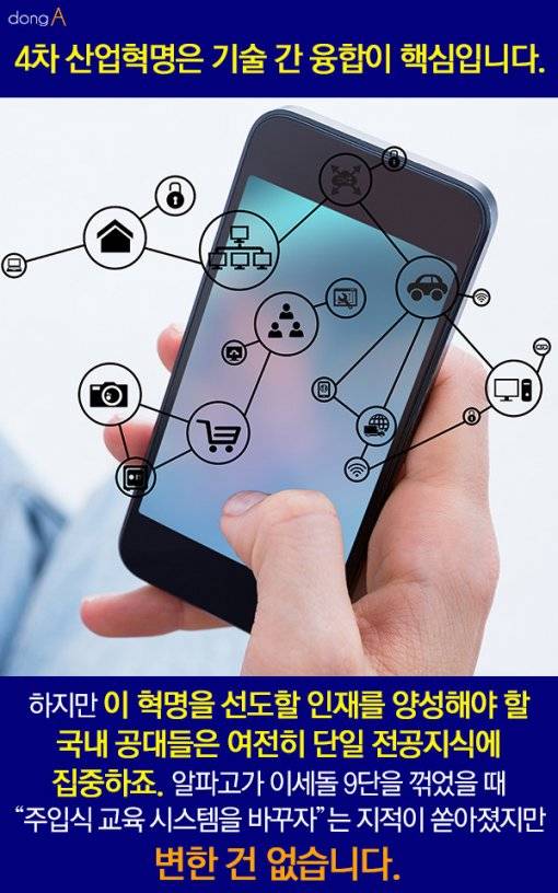 하지만 이 혁명을 선도할 인재를 양성해야 할 국내 공대들은 여전히 단일 전공지식에 집중하죠. 알파고가 이세돌 9단을 꺾었을 때 “주입식 교육 시스템을 바꾸자”는 지적이 쏟아졌지만 변한 건 없습니다.