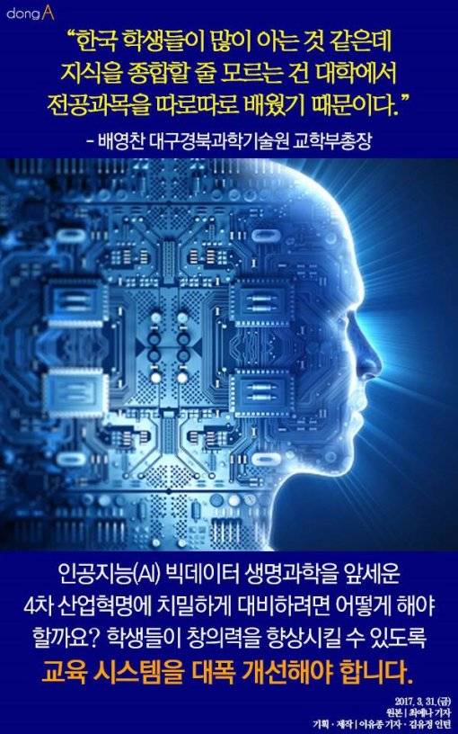 인공지능(AI) 빅데이터 생명과학을 앞세운 4차 산업혁명에 치밀하게 대비하려면 어떻게 해야 할까요? 학생들이 창의력을 향상시킬 수 있도록 교육 시스템을 대폭 개선해야 합니다.