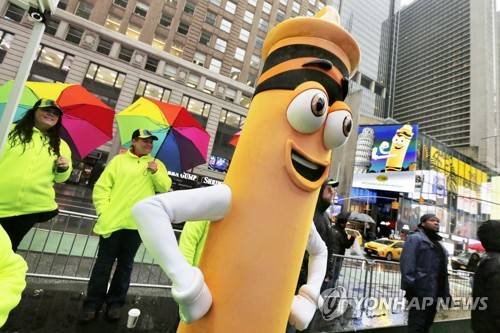 A dandelion crayon character poses for photos during a Crayola event in New York's Times Square, Friday, March 31, 2017. Crayola announced Friday, National Crayon Day, that it's replacing the color dandelion in its 24-pack with a crayon in "the blue family." (AP Photo/Richard Drew)
