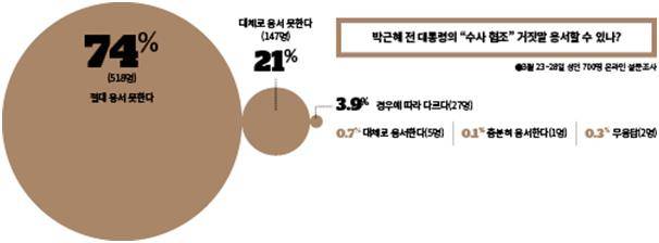 박근혜 전 대통령이 대국민담화까지 열어 적극적인 수사협조를 약속해놓고도 얼굴을 바꾼 점에 대해서는 ‘절대 용서할 수 없다’는 응답이 518명(74.0%), 대체로 용서할 수 없다는 응답이 147명(21.0%)나 됐다. 헌법재판소가 박 전 대통령에 대해 “헌법수호 의지가 없다”고 판단한 근거 중 하나였던 이 거짓 발언은 사회에 큰 혼란을 끼친데다, 반성이나 사과가 부족하고, 끝까지 진실규명을 방해하는 등 ‘용서할 수 없는 이유’ 1, 3, 4위의 면모를 동시에 드러냈다.