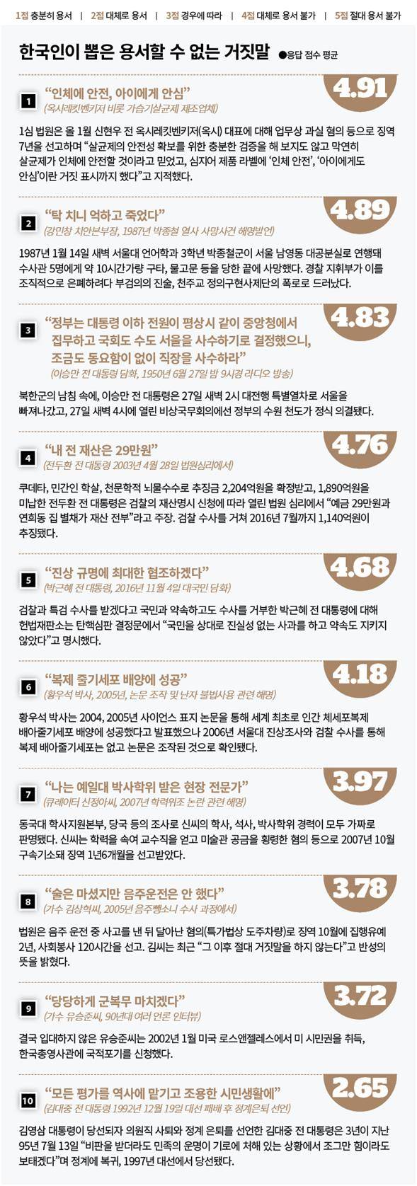 4~7위에 오른 나쁜 거짓말은 ▦전두환 전 대통령의 “전 재산이 29만원” 발언(4.76점) ▦박근혜 전 대통령의 “진상 규명에 최대한 협조하겠다”는 약속(4.68점) ▦황우석 박사의 “복제 줄기세포 배양에 성공했다”는 조작 논문(4.18점) ▦큐레이터 신정아씨의 학력 위조(3.97점)다.