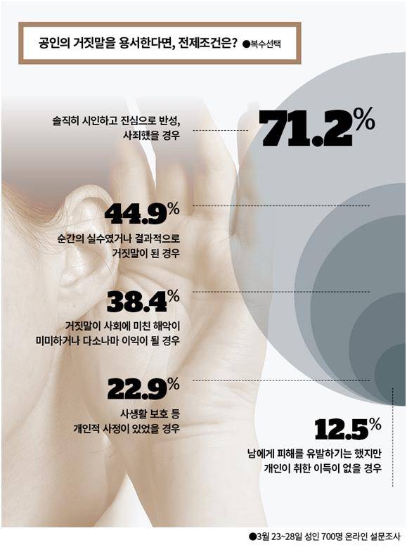 구체적으로 ‘용서할 수 없는 이유’를 묻는 질문(복수응답)에도 ‘사회에 끼친 혼란 피해 규모가 막대함’(78.9%ㆍ551명)을 꼽은 응답자가 가장 많았다. ‘실수가 아니라 거짓말로 이득을 취하려 한 고의성’(60.7%ㆍ424명)과 ‘거짓이 드러났는데도 반성, 사죄 않는 몰염치’(60%ㆍ419명)가 뒤를 이었다.