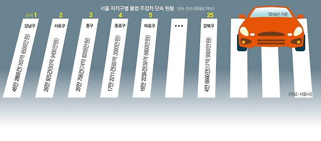 시 관계자는 “강남, 종로 등 도심 지역은 차량이 많이 몰려 불법 주정차가 교통 혼잡에 미치는 영향이 크다”며 “이 때문에 자치구에서도 단속 인원을 늘리고 과감하게 단속하는 편”이라고 설명했다.