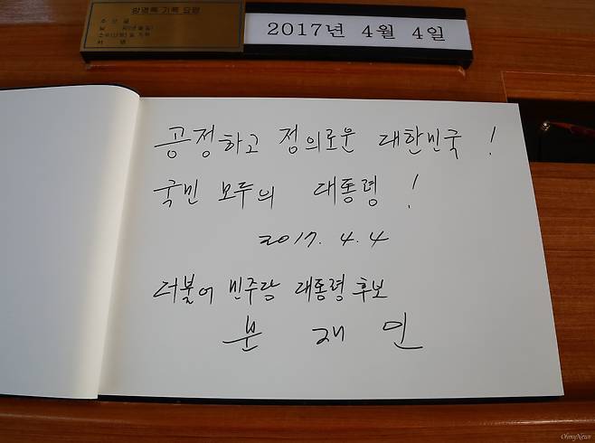 | ▲ 문재인 후보 국립현충원 방명록 더불어민주당 문재인 대선후보가 4일 오전 후보 첫 일정으로 국립서울현충원을 참배하며 ‘공정하고 정의로운 대한민국! 국민 모두의 대통령! 2017.4.4 더불어민주당 대통령 후보 문재인’이라고 방명록을 작성했다. |