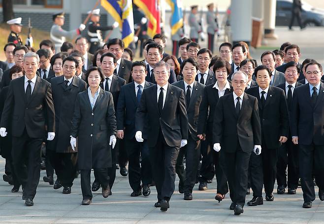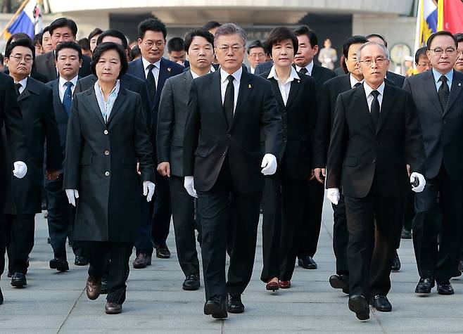 | ▲ 문재인 후보 국립현충원 참배 더불어민주당 문재인 대선후보가 4일 오전 후보 첫 일정으로 추미애 당 대표 등 지도부와 함께 국립서울현충원을 참배하고 있다. |