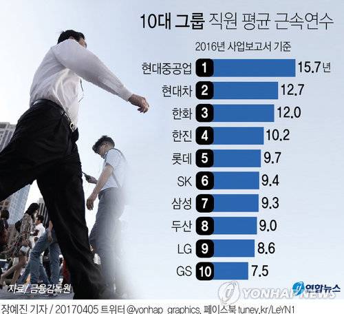 (서울=연합뉴스) 박상돈 기자 = 10대 그룹 주요 계열사에 근무하는 직원들의 근속연수는 평균 10년이었다.