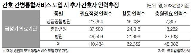 그럼에도 통합서비스 확산이 더딘 것은 간호 인력 문제가 발목을 잡고 있어서다. 의료계 관계자는 “환자들이 선호하는 통합서비스를 도입하고 싶어 하는 병원들이 줄을 섰지만, 인력 기준을 맞추지 못해 문턱에서 좌절한다”고 전했다. 상급종합병원은 간호사 1명당 병상 5~7개 기준을, 종합병원은 1명당 병상 7~12개 기준을 맞춰야만 통합서비스 사업에 참여할 수 있다.