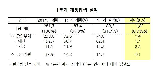ì´ì— ë”°ë¼ ì „ë¬¸ê°€ë“¤ 사ì´ì—서는 새 ì •ë¶€ 출범 후 ì¶”ê°€ê²½ì • 예산(추경)ì„ íŽ¸ì„±í•´ 대ì‘í• ê²ƒì´ë¼ëŠ” ì „ë§ì„ ë‚´ë†“ê³ ìžˆë‹¤. 6ì¼ ê¸°íšìž¬ì •부는 경기활성화와 ì¼ìžë¦¬ ì°½ì¶œì„ ìœ„í•œ ìž¬ì • ì¡°ê¸°ì§‘í–‰ì— ë°•ì°¨ë¥¼ 가해 1ë¶„ê¸°ì— 89ì¡°3000ì–µì›ì˜ ì˜ˆì‚°ì„ ì§‘í–‰í•´ 당초 계íš(87ì¡°4000ì–µì›)보다 1ì¡°8000ì–µì› ì´ˆê³¼ë‹¬ì„±í–ˆë‹¤ê³ ë°í˜”다. ì´ëŸ¬í•œ 집행실ì ì€ ì „ì²´ ê´€ë¦¬ëŒ€ìƒ ì˜ˆì‚°ì˜ 31.7%를 집행한 것으로 당초 ê³„íš 31.0%ì— ë¹„í•´ 0.7%í¬ì¸íЏ 초과집행한 것ì´ë‹¤.