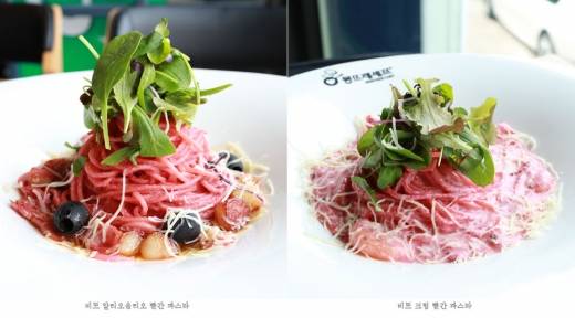 비트 빨간 파스타 2종은 파스타의 느끼함을 없애고, 한국인 취향에 맞는 약간 매콤 알싸한 맛이 나는 게 특징이다. 또한, 비트가 파스타 면에 스며들면서 깔끔하고 구미가 당기는 빨간 색을 띈다.