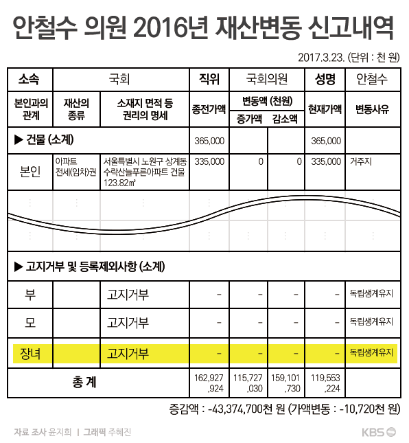 실제로 안 의원이 제출한 2016년 재산변동 신고내역에도 장녀의 경우 '독립생계유지'를 이유로 고지거부한 것으로 나와 있다.