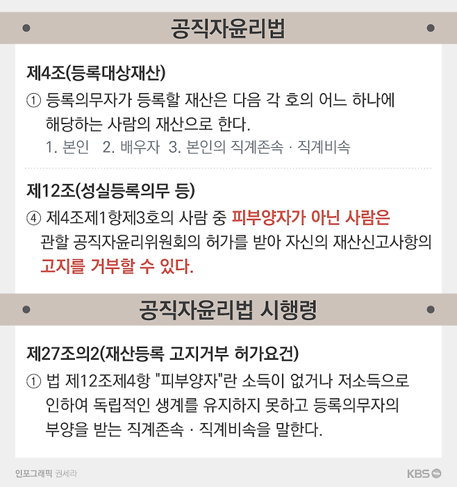 즉, 등록의무자로부터 부양을 받지 않고 독립적으로 생계 유지가 가능한 직계존비속의 경우 재산 등록을 거부할 수 있다는 것이다.