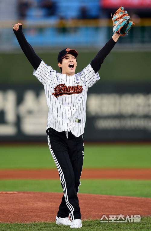 부산출신의 가수 블락비의 재효가 승리기원 시구를 하고 있다.