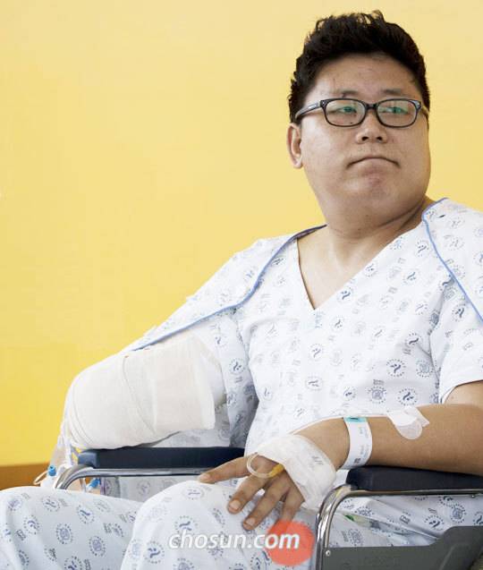 흉기에 찔린 곽씨는 동작구 보라매병원으로 이송돼 지난 8일 오전 2시부터 7시간에 걸친 수술을 받았다. 오른팔 동맥과 오른손으로 이어진 신경 6개가 절단된 상태였다. 9일 보라매병원 병실에서 만난 곽씨는 "엄지손가락을 뺀 오른손 손가락 4개가 모두 아무 감각이 없는 상태"라며 "병원 측으로부터 재활 기간이 2년 정도 걸리고 운동신경이 70%밖에 못 돌아올 가능성이 있다고 들었다"고 말했다.
