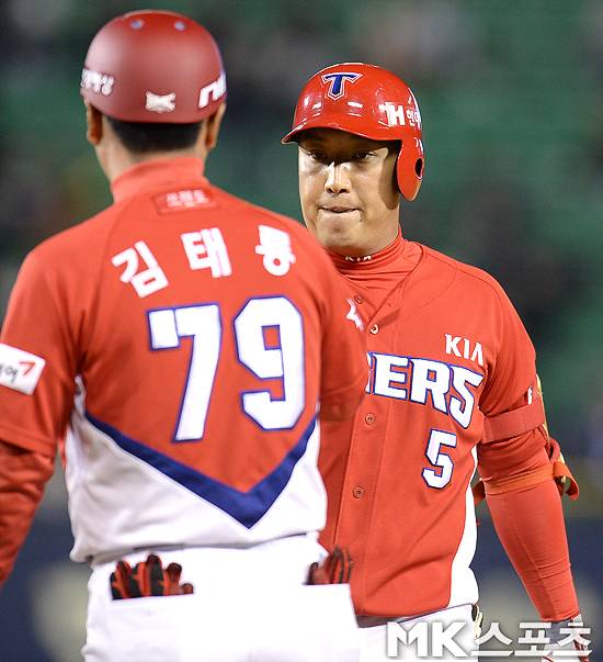 4회초 1사 1루 기아 김지성이 안타를 치고 김태룡 코치와 주먹을 맞대고 있다.
